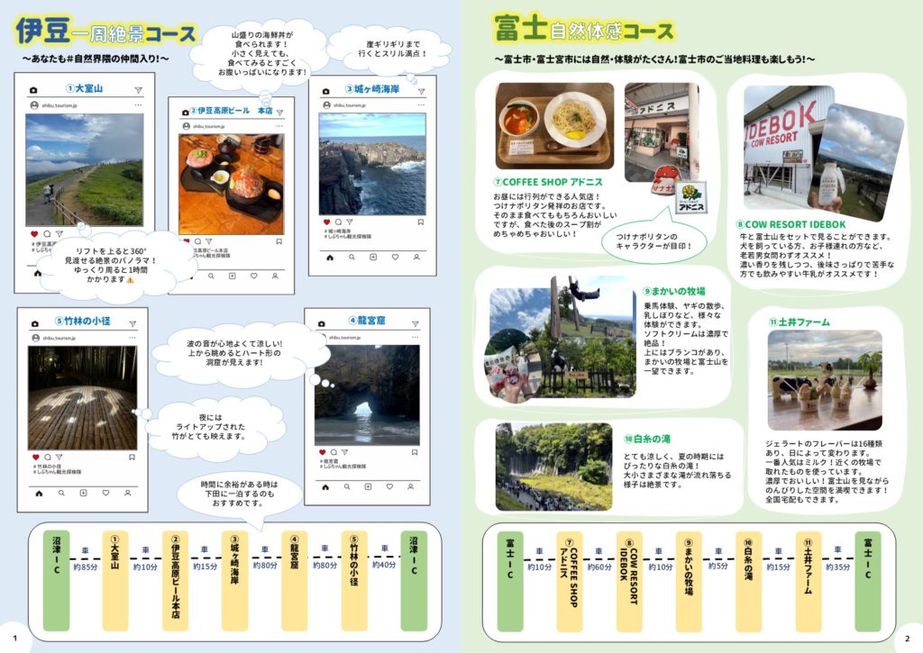 常葉大学経営学部澁谷ゼミでは2024年度に中日本高速道路株式会社様との共同研究を行い、自家用車及び高速道路利用者に向けた静岡県内の観光マップを制作しました。学生が県内を巡って厳選した観光スポットやグルメを紹介するとともに、伊豆、県東部・中部・西部の各エリアで、計5つのモデルコースを提案しました。